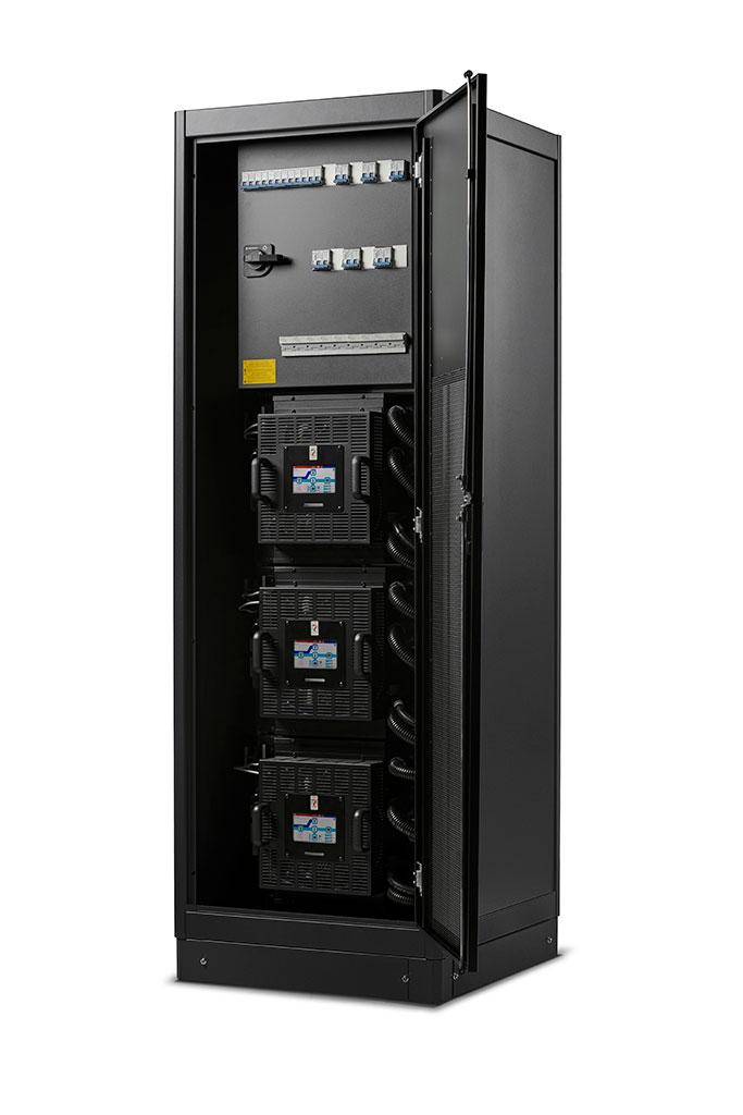 The Sentryum Rack cabinet is available in 2 versions, single-phase and three-phase output; it is designed to house up to 3 modules (60 kVA/kW) and up to 3 cabinets can be connected in parallel for a total of 8 modules and 160 kVA/kW of power. The Sentryum Rack cabinet has a distribution panel that contains all the devices to disconnect each module (3 input rectifier disconnectors, 3 input bypass disconnectors, 3 output disconnectors, 3 battery fuse holders), as well as maintenance manual bypass for completely isolating the 3 modules and guaranteeing power continuity to the load. Both modules and cabinets are provided with the bypass line separated from the rectifier line, by ensuring greater availability of the power supply to the UPS system and consequently extending this benefit to the load.